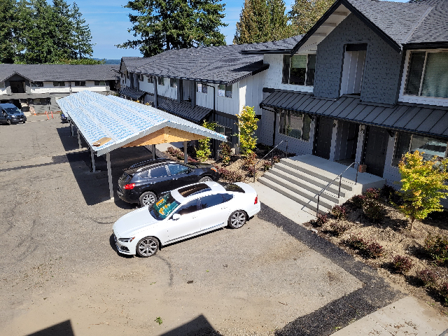 Exterior renovations include the installation of new siding to each building. The private decks were completely rebuilt with a new roof structure over the previously uncovered decks. The building entries also recieved new roof elements to create better weather protection at the interior stair, as well as increased aesthetic appeal.